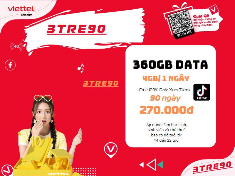 Nội dung bài viết này mời bạn tham khảo thông tin gói TRE90 của Viettel để tìm hiểu thông tin chi tiết và đăng ký sử dụng ngay khi có nhu cầu bởi đây là gói cước Viettel khuyến mãi dành riêng cho thuê bao di động trả trước giới trẻ có chủ thuê bao trong độ tuổi từ 14 đến 22 tuổi kích hoạt mới kể từ 01/06/2022 đăng ký sử dụng nhận nhiều ưu đãi data tốc độ cao vô cùng lớn.
